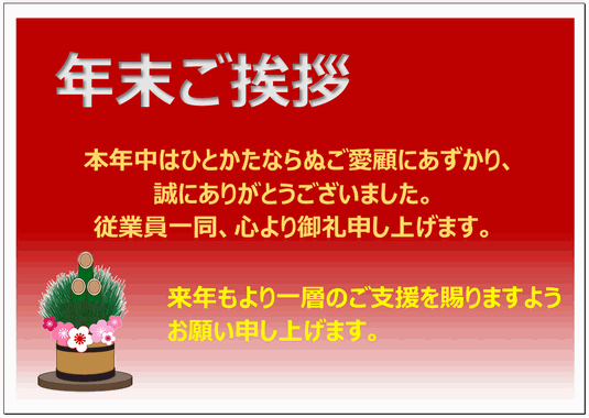 年末挨拶 2025年12月29日 今年一年、大変お世話になりました。 皆さまのご愛顧により、1年過ごすことができました。 皆さまもお身体を大切にご自愛ください。 新年は、1月4日の日曜日から、スタートします 宜しくお願い致します。